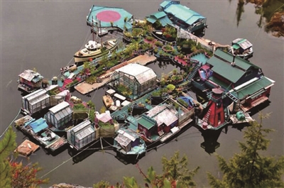 一对来自加拿大的夫妇为逃离城市拥挤的生活环境搬到了不列颠哥伦比亚省的托菲诺海岸,住在一座水上建筑里。这对名为韦恩·亚当斯和凯瑟琳·金的浪漫夫妻给这座融合了木质构造、温室大棚和居住空间的建筑取名为“自由之港”。“自由之港”建于1992年,一共有12间小屋,都被漆成鲜艳亮丽的紫红色和蓝绿色。亚当斯夫妇和他们的两个孩子一年到头都住在这里。