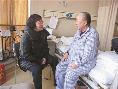 图为北京市和平里医院工会主席葛兰(左)看望住院市级劳模吕少云。