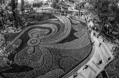 北京植物园的郁金香已进入最佳观赏期。昨天,植物园为了让广大读者欣赏到郁金香花海全景俯瞰效果,首次允许记者登上12米高的升降车俯拍郁金香。在近万平方米的郁金香花海展区内,105个品种的50万郁金香竞相开放,犹如一只蝴蝶在花的海洋中飞舞。本报记者 邱勇 摄影报道