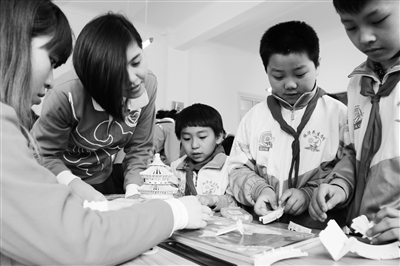 看着天坛、东方之珠、北京四合院等建筑模型在自己的手里成形、完善,孩子们乐得手舞足蹈。