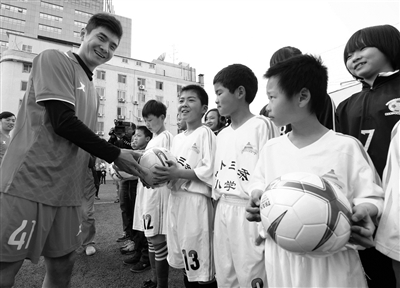 昨天,奥运体操冠军邢傲伟作为首都媒体足球联队的代表来到地坛体育场,参加“八喜杯首都媒体足球联队校园行”活动启动仪式。邢傲伟向学生代表赠送了小足球等礼物。在为期一年的活动期间,球队的各家媒体骨干足球记者将分批深入到北京市东城区的十余所中小学,采访和发掘校园足球发展的成功经验及基层校园足球面临的难题,通过丰富多彩的形式,积极开展多种校园足球普及与宣传推广活动。