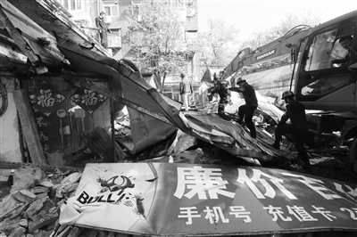 昨天,海淀区城管大队联合公安、工商、消防等多个部门,在北太平庄街道办的统一组织协调下,出动200余人对海淀区索家坟小区内108处、2800平方米的违建进行强制拆除。据了解,该小区周边居民占地私搭乱建并出租牟利,存在较大安全隐患。本报记者 孙妍 摄影报道