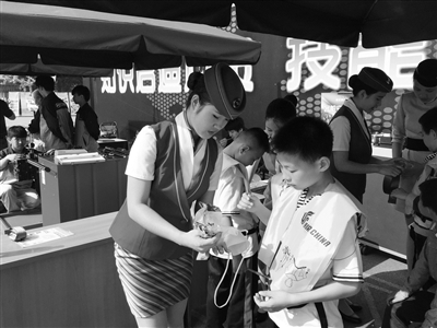 昨天上午,首届北京市职业教育宣传月暨2015年北京职业院校技能比赛启动。本市今后将把每年4月15日至5月15日定为职业教育宣传月,期间京城一百多所职业院校敞开校门,邀请居民、学生等参与职业体验课程。当天,丰台职业教育中心学校准备了22项体验项目,图为空乘专业学生教孩子如何穿救生衣。本报记者 周美玉 摄影报道