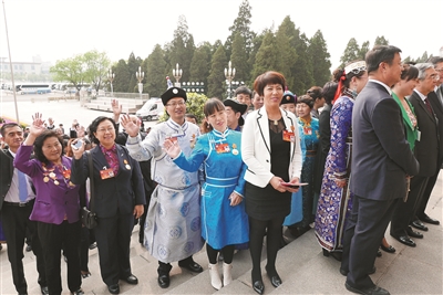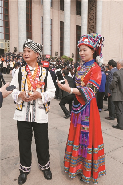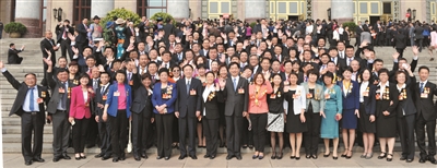 表彰大会开始前,来自全国各地劳模就开始相互交流,讲述劳动奖章背后的故事。特别是少数民族劳模代表风采成为现场的一道亮丽风景,大家纷纷在礼堂外合影留念,2015年京城的春天,因为他们更加美丽。