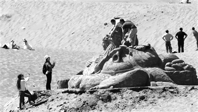 5月2日,新疆吐鲁番鄯善县库木塔格沙漠风景区游客人数剧增,高温下的大漠风光、沙漠中神态各异的沙雕作品,吸引游客流连忘返。遗憾的是,一些游客不听从景区管理人员劝告,肆意攀爬沙雕拍照留念,导致许多座沙雕作品遭到严重毁坏。(5月3日国际在线)