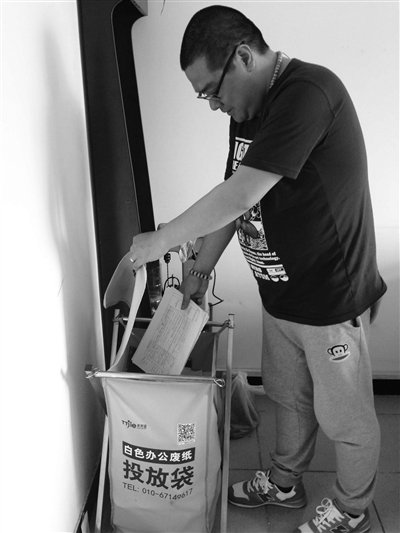 一摞两面用过的A4纸张,北京市政路桥养护集团市政五处工程部的唐喆随手就放进了“白色办公废纸投放袋”里。过一段时间,等这个袋子装满后,他们就用这些废纸换回一些铅笔、橡皮、笔芯、纸张等办公用品。在北京养护集团市政五处,这样的环保袋一层一个,大大方便了可再生废品的收集。