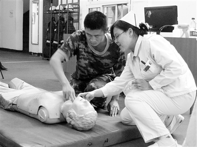 五四青年节当天,北京市普仁医院的青年党员志愿者来到花市消防中队,为消防官兵们进行了急救培训。图为医生正在为官兵们做心肺复苏示范。通讯员 邝歌 摄影报道