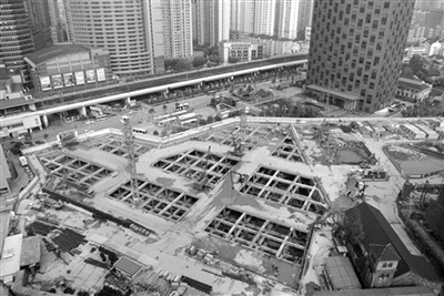 来福士项目施工难度大,主要原因是它坐落在繁华的中山公园商业区,四周高楼环绕且布满交通线路。在其西侧,地铁2号线穿地而过,还有一座百年古建;距东南侧15米处是158米高的雅仕大厦,30米外是轨道交通3、4号线;其北侧,有相距11米的上海轨道交通警局大楼,还有超过200米高的龙之梦大厦;其正南侧,是已建20多年居民小区,地基稳定性差。在这样的环境里,在这样的软土层中开挖一个18.92米深、近2万平方米大的大坑,还要确保周边无“事”,其难度可想而知,其风险也使不少人知难而退。