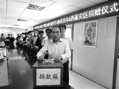 尼泊尔地震波及我国西藏地区,日喀则吉隆县和聂拉木县灾情严重,灾情牵动着中建二局三公司项目职工的心。“五一”期间,中建二局三公司武汉中央文化区K6、K7地块项目、电影乐园项目、沙湖候船厅游艇码头项目联合工会,在K6、K7项目部会议室联合举行了救助捐赠仪式,捐款当天就筹集首批善款7000元。目前,捐款仍在进行中。本报记者 马超 通讯员 吴兰军 摄影报道