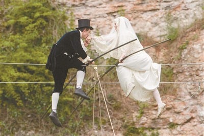 5月1日,在英国萨默塞特,克里斯·布尔与菲比·贝克在伍基山洞举行婚礼。他们将浪漫演绎到了新高度——穿礼服走过25米高75米长的绳索,在中间牵手,然后说出“我愿意”。这是英国首例“钢丝上的婚礼”。新娘新郎在山洞中举行结婚仪式。