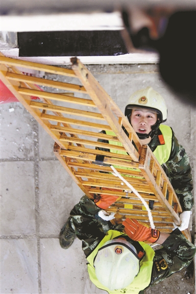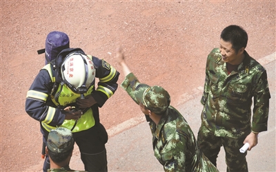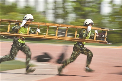 在基地的操场上,这边进行着百米障碍赛,同时,那边的训练塔上进行着双人攀登两节拉梯操。在两个人的配合下,消防战士借用梯子,从建筑外立面迅速攀至二层楼。“科目设置贴近实战,检验实战训练水平。像两节拉梯攀登这种项目的设置,主要目的就是使官兵能够实现‘像打仗一样训练、像训练一样打仗’。”北京消防总队相关负责人介绍。