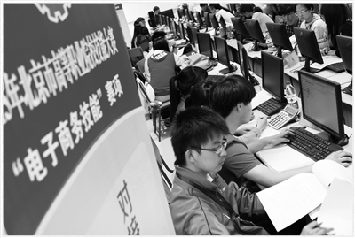 “现在比赛开始,每组有5分钟的时间进行采购,如果出现破产的情况及时举手报告,并停止程序!”在“电子商务技能”赛项的比赛现场,随着主考人员的口令,每名考生四人一组,紧张地进入了比赛程序,他们将通过电脑的模拟经营系统,完成采购、招标、推广、销售等多个环节程序,以最终的盈利情况来“一决胜负”。记者看到,团队中的一名主创人员快速地通过采购系统按照预算的额度“进货”,分别采购了电风扇、珍珠项链等应季物品。旁边的助手则快速地进行统计,并小声和团队成员分析下一步的推广程序。