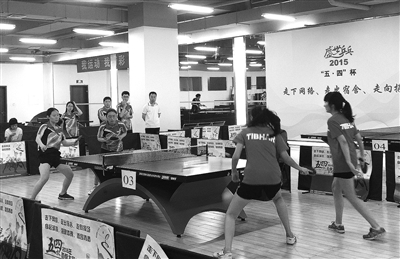 本报讯(记者 任洁)火红的青春——“走下网络、走出宿舍、走向操场”“五四杯”2015年首都大学生乒乓球赛总决赛昨天在北京体育馆举办。球赛共吸引到55所高校的5000余名大学生参与,经过层层角逐,来自北大、清华、北师大等16所学校的代表队进入了总决赛。