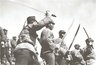 《大刀进行曲》是抗日歌曲中慷慨激昂的一首。表现的是国民革命军第二十九军士兵练就一手高超的大刀术,夜袭日军营,抡起大刀向睡梦中的鬼子头上砍去,从此,二十九军的名字威震全国。