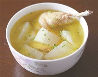 推荐理由:用料简单,只需新鲜连皮冬瓜250克,鸡肉100克。将冬瓜切小块,与鸡肉同加适量水炖熟放温服用即可。