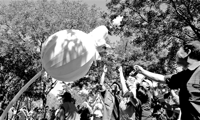 昨天,在陶然亭公园内,一个硕大的“不倒翁”向市民发放旅游咨询宣传品。当天,北京市旅游委围绕“爱生活、爱旅游”的主题,主办了“5·19中国旅游日北京旅游推广活动”,向市民普及“文明出游”、“安全出行”和“智慧旅游”的文明旅行理念。本报记者 陈艺 摄影报道