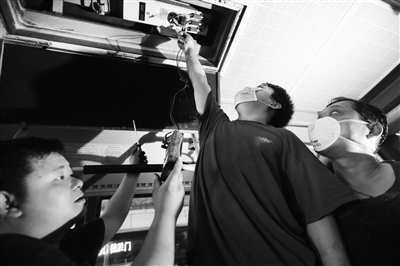 昨天,公交保修三厂的工人正在为公交车空调逐一进行系统体检。检修人员说,此次公交车换季大体检将重点对2183部公交运营车辆水箱及车内水循环系统进行清洗和检修,保障空调制冷效果,确保高温天气下市民的安全出行。本报记者 孙妍 摄影报道