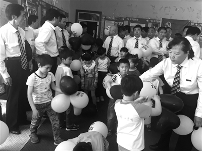 “阿姨,叔叔,谢谢你们来看我们!”顺义太阳村的孩子们拿着气球,开心地对银建的士共产党员车队的的士司机们说。