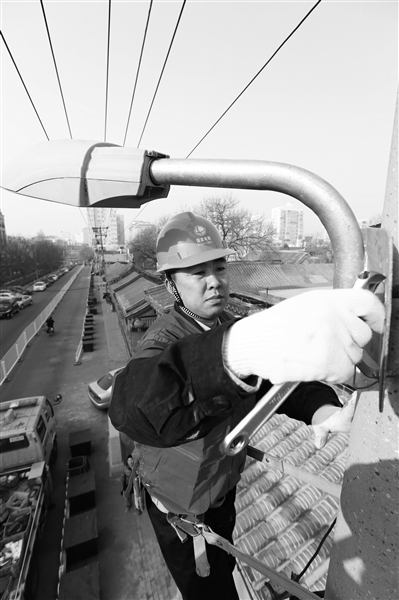夜晚降临,一排排路灯点亮老北京静谧的胡同。为了路人的照明,路灯检修人员每天都穿梭在胡同。张福明就是其中一个,他今年29岁,是一个个子不高皮肤黝黑的吉林小伙儿,从2010年来到北京市城市照明管理中心工作至今,一直从事路灯检修工作,现任党员服务班夜班组组长,也是胡同里的修灯“行家”。