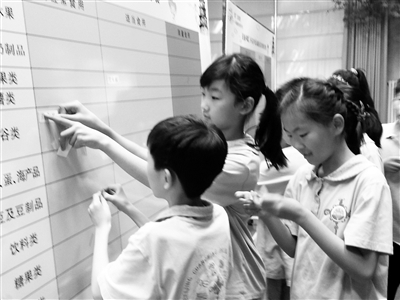在活动现场的一块展示板上,分别贴了“鼓励多吃、尽量少吃和最好不吃的食物举例”、“三个推荐级别的零食举例”两张黄红绿三色表格,其中绿色代表“鼓励多吃”,黄色代表“尽量少吃”,红色代表“限量食用”。光明小学五年级的10多名同学手里拿着多张食物卡片,正在根据自己的判断,把卡片填到相应的表格中。记者看到一位同学将鸡翅放到了“尽量少吃”一栏,将橙汁汽水和含糖碳酸饮料放到了“限量食用”一栏。