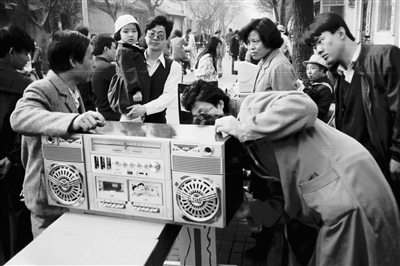 “板儿砖”在社会上流行没几年,很快就出现了双卡录音机,这种录音机功率大、功能多,不但有播放功能,还有转录复制功能。街道社区要是有个大活动,摆上一台双卡录音机,播放几首音乐,立马会吸引不少居民围观,很多年轻人还会伴随着音乐跳起时髦的街舞。不过一盘磁带顶多能放七八首歌曲,大约45分钟到一个小时。这种磁带式录音机还有一个缺点,有时候磁头会将带子缠绕起来,播放曲子的遍数多了音质也会有变化。30多年前,牛街街道要办个活动,当时的宣武区科技馆拿出了一台双卡录音机,为活动播放音乐,吸引了不少市民驻足观看。见到这新玩意,大家赞叹不已,只可惜这种大件奢侈品咱老百姓家庭还买不起。那时候,我在现场拍摄这张照片,也是为展示改革开放、社会发展进步的成果。