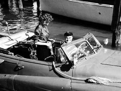 1805年美国人发明第一辆水陆两栖车。比较有名的水陆两用车就是二战期间德军装备的大众水陆两用车。图为1957年贝克·约翰逊夫妇驾驶一辆改装的别克水陆两栖汽车在底特律河上畅游。
