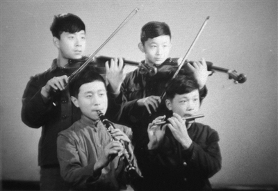 第一幅“乐队四主力”的照片拍摄于1963年6月1日。当时在校园里小有名气的陶相才大哥(后排左一),是哈尔滨市第一机械厂子弟学校有名的小提琴手。这是在全市六一儿童节汇报演出后,他与学校乐队的另外三位主力的合影留念。