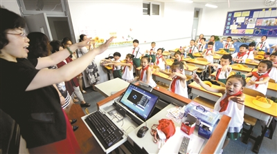北京小学走读部一年级七班的学生在老师的带领下进行登台前的最后一次排练。