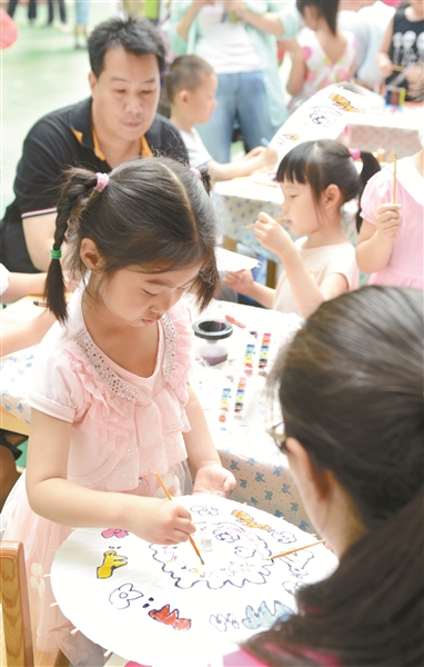 在东四五条幼儿园庆祝“六一”儿童节的活动中,家长和孩子们共同创作绘画作品。