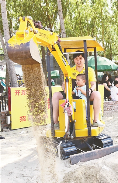 在通州区安君洲开心农场,很多家长带着学龄前的宝宝在模拟工地上玩“挖掘机”,培养孩子的动手能力。