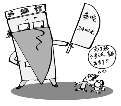 伴随着北京市101个高考考点的相继公布,一年一度的“抢”房大战再次打响。记者致电人大附中附近的北京中关村皇冠假日酒店,酒店工作人员表示标价2171元的高级房已经被订满,而该酒店6月5日的高级房标价为1251元,仅一夜之差,房价涨了920元,其余房型在高考期间也都涨了近千元。 (6月3日 人民网)