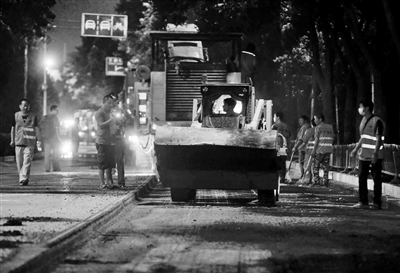 6月3日0时,在三环丰益桥的辅路处,一台铣刨机正在施工。记者从交通委路政局获悉,目前三环辅路丽泽桥-玉泉营桥段、赵公口桥—劲松桥段大修工程已经启动,全线在道路病害处理的基础上加铺一层4厘米的改性沥青。总里程共11公里,将于7月完工,这标志着三环辅路在五年内全线大修的完成。本报记者 周美玉 文 于佳 摄影报道