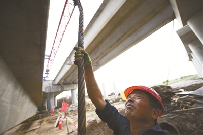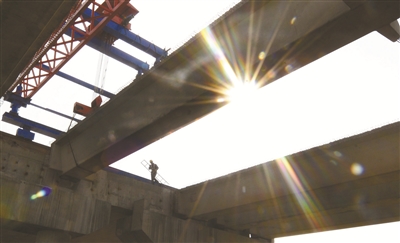 距地面10米高的桥面上,工人靳占江戴着防护镜正在对护栏钢筋进行焊接加工,截至发稿时止,市政路桥总承包一部负责路段已完成4277根桩基施工,墩柱完成2667个,梁板安装完成1208片。根据施工计划,北段和南段将跨湖北省103国道实现对接。黄智军说:“接下来将加快梁板预制和现浇箱梁施工进度,向2016年5月通车目标冲刺。”