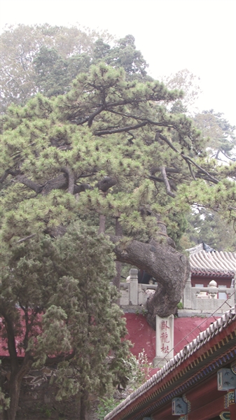 九龙松是一体形硕大的白皮松。它屹立在戒坛院的山门前,郁郁葱葱的绿冠高达十八米,至今已有一千多岁。此松九条硕大枝干犹如九条银龙腾空飞舞,因此而得名。