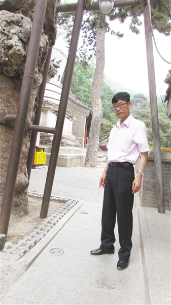 记者在潭柘寺的门口见到了王宝国,在记者跟他打招呼的前一秒钟,瘦瘦的王宝国还戴着一副黑框眼镜往门口的几棵古树上瞅,“我们刚刚进行过一次松果的梳理工作,我再看看还需不需要其他一些养护工作。”见记者走来,王宝国边跟记者打招呼边说。