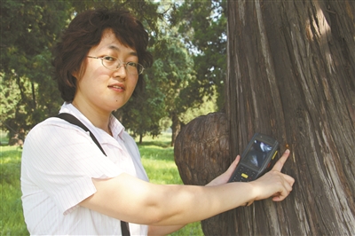 怎样才能了解这些信息呢?张卉背着一个小包,里面装信息处理器,带着记者走到一棵古树前,指着树上一个不起眼的小钉子对记者说:“这个小钉叫信息钉。每棵古树北侧1.5米的胸径上,都钉了这个信息钉。”张卉拿着信息处理器对着小钉子一扫古树的信息就显示出来,并且传送到她的办公室里的电脑。