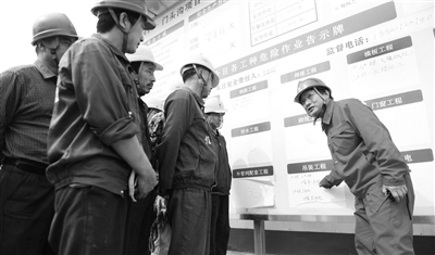 北京住总三公司把安全生产工作当成头等大事紧抓不放。为时刻警示职工不忘安全二字,近日,公司在所有工程工地的职工通道处竖起安全生产指示牌,对当天的施工工序,特别对高危工种的作业程序作出明显警示,让职工一上班就先对安全生产提起足够重视。 本报记者 万玉藻 摄影报道