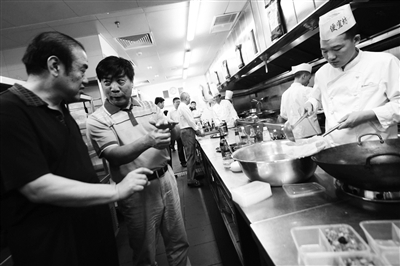 便宜坊专家管理学院成立当天,三位专家在便宜坊甜水园店参观,并对店里的经营管理及菜品等进行了第一次现场授课指导。