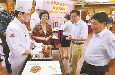 6月10日,在纪念第十个国际“非物质文化遗产日”之际,北京老字号协会在全聚德王府井店为第二批老字号颁牌。亿兆、奶酪魏、通州丽新照相馆、北京剧装厂等北京14家企业荣获“北京老字号”称号,并获得具有集体商标图形的北京老字号牌匾和特许使用证书。14家北京老字号颁牌仪式后,中华老字号全聚德和老字号同行进行经验交流,并展示“盛世牡丹”烤鸭。本报记者 周世杰 摄影报道