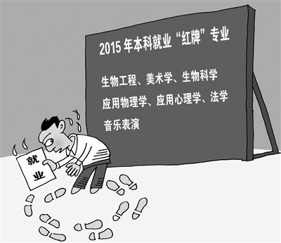 2015年就业蓝皮书发布,2015年本科就业“红牌”专业包括:生物工程、美术学、生物科学、应用物理学、应用心理学、法学、音乐表演,其中法学、生物工程、美术学专业上届也是“红牌”专业。专家表示,“红牌”专业指的是失业量较大,就业率、薪资和就业满意度综合较低的专业。(6月10日《北京日报》)