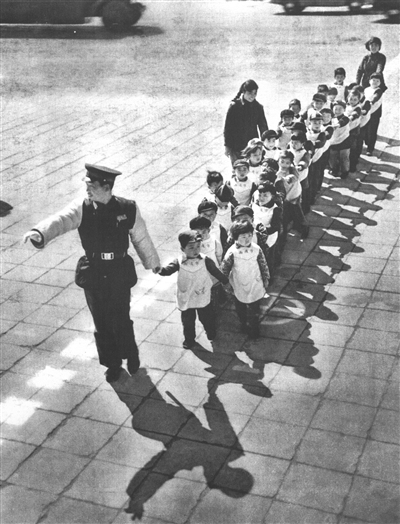 这张照片是1957年由王一波、柯复在北京街头拍摄的,照片中一名北京交通民警牵着小朋友的手,正在护送他们过马路。
