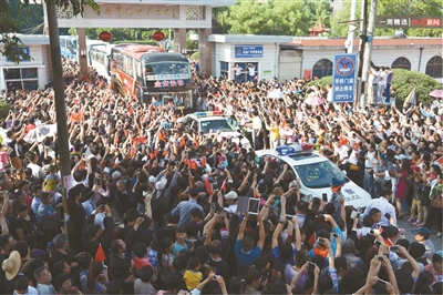 2015年6月5日,安徽六安,被称作为“亚洲最大高考工厂”的安徽六安毛坦厂中学近万名高三考生前往市区备战高考,当地民众和高考考生家长过万人前往送考。