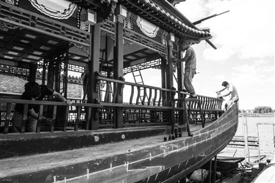 北海公园近30年来首次更换的全新摆渡大画舫“新翔鸾”将于7月1日正式下水运营。目前新的摆渡大画舫“新翔鸾”正在进行最后一道工序油饰彩画工程。油饰彩画工程将于6月20日左右结束,“七一”当日正式下水运营。本报记者 邱勇 摄影报道