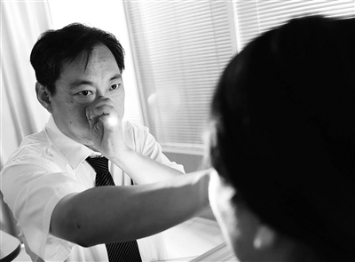 上午10点,位于大明眼镜王府井旗舰店五层的首席验光技师工作室是最忙碌的时候。在等候验光区,已经有十几个人排队了,有的还专门从外地赶来。在工作室内,验光大师秦英瑞和另一位高级技师正在为顾客验光。