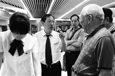 秦英瑞正在服务的顾客是点名来找他的,是位72岁的老大爷,姓马。马大爷坐在验光仪器旁边,秦英瑞聚精会神地看仪器,随后又问了很多戴眼镜的使用感受以及配镜需求等问题,非常细致。
