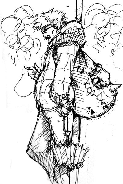 在肖吉的画笔下,一个个偶遇的陌生人都呈现出鲜明的个性,加上天马行空的“解说”,让每幅手绘漫画都像一篇小说,充满奇趣。比如,有背着恐龙包的潮人老爹,有头戴耳麦沉浸在自己世界里的年轻人,有大声唱英文歌的学生。