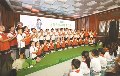 “守护宝贝”安全课堂进校园活动昨天在北京府学胡同小学启动。今年出任该公益活动“安全大使”的中央电视台主持人芝麻,将带着少年儿童安全教育读本,在全国100所小学内开展安全教育公益课堂,向同学们传授防拐、防骗、家庭日常用火用电、户外交通安全、野外生存等自护技能,提升中小学生的自我保护能力。“守护宝贝”公益活动是在全国妇联等单位指导下,由人民日报新媒体、人民公安报社、中国警察网等单位发起。图为府学胡同小学的同学在启动仪式上背诵《弟子规》。(新华)