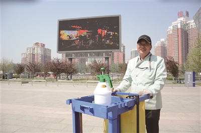 作为一名外围保洁员,郝锡杰最主要的工作就是打扫果皮箱。郝锡杰在的责任区共有25对儿果皮箱,一天最少要清理更换一次。“按照要求垃圾超过果皮箱的三分之一就要清理,赶上人多的时候同一个果皮箱一天要清理好几次。”郝锡杰一边介绍,一边清理果皮箱。