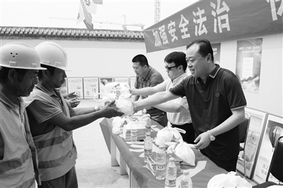 16日,在“石景山东下庄北路道路工程及东下庄北路中水排水工程”举行的安全月活动中,市政路桥市政集团易成公司领导将200多本图文并茂的安全知识书籍送到一线工人手中。安全月期间,各项目部将通过开展安全签名、安全知识培训、提安全合理化建议等活动,在施工人员中普及安全知识。本报记者 边磊 通讯员 李向东 摄影报道