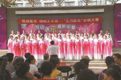 以“悦动莲花 唱响太平桥”为主题的太平桥地区2015年“五月的鲜花”红歌合唱大赛决赛,经过近一个月的筹备、演练、预赛,于5月29日在太平桥街道精图文化广场举行。此项活动由太平桥街道总工会、文教科联合举办,共有16个社区联合工会合唱队进入了决赛。 比赛中,各参赛队衣着整齐,演唱形式各具特色。精图社区联合工会合唱队演唱的《黄水谣》,先是男声齐唱开始,接着深沉、痛苦、激动而愤恨的混声合唱,控诉了敌人的残暴罪行;蓝调社区联合工会合唱队倾情演唱的《解放区的天》,充分调动现场观众参与合唱;天伦北里社区联合工会合唱队更是别出心裁,身着红军时期的服装,演绎出了革命根据地人民对红军的深厚感情以及对革命成功的强烈期盼。情景交融,把现场观众带入了相送场景,使人感到情真意切、难舍难分,全体演员们用动人的歌声抒发自己的满腔情怀,积极向上的精神风貌感染着现场的每一个人,使得现场的掌声和喝彩声一浪高过一浪。